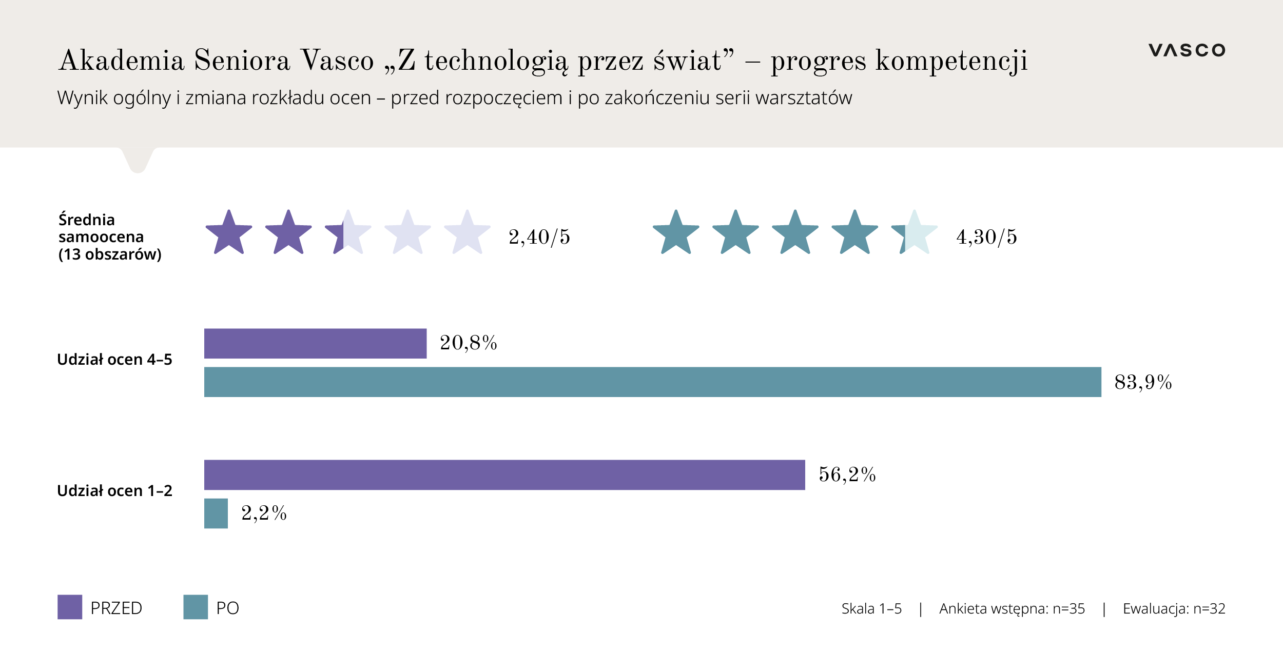Wyniki badania ewaluacyjnego przeprowadzonego po zakończeniu programu jednoznacznie potwierdzają jego skuteczność. Uczestnicy Akademii oceniali swoje kompetencje w pięciostopniowej skali od 1 (brak pewności) do 5 (pełna biegłość). Średnia samoocena w 13 kluczowych obszarach wzrosła z oceny 2,40 przed startem Akademii do 4,30 po jej zakończeniu, co oznacza przejście od poziomu „raczej niepewny” do „dobrze/bardzo dobrze”.
