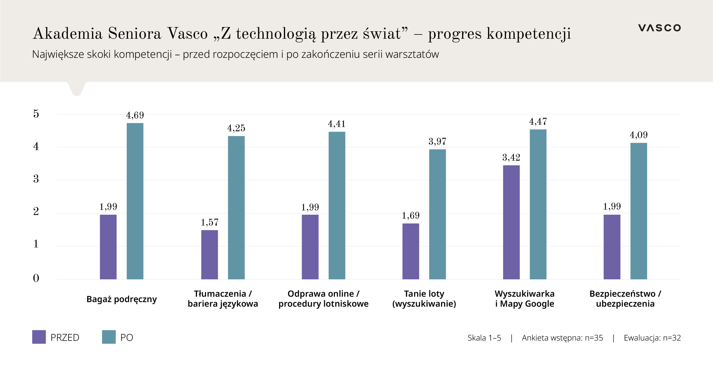 Akademia Seniora Vasco powstała jako odpowiedź na konkretne bariery, które jak pokazują badania wciąż ograniczają samodzielność wielu seniorów w podróży. W ankiecie przeprowadzonej przed startem programu ponad połowa uczestników nisko oceniła swoje kompetencje w wyszukiwaniu lotów, a 86% deklarowało, że nie radzi sobie z aplikacjami i urządzeniami do tłumaczeń.